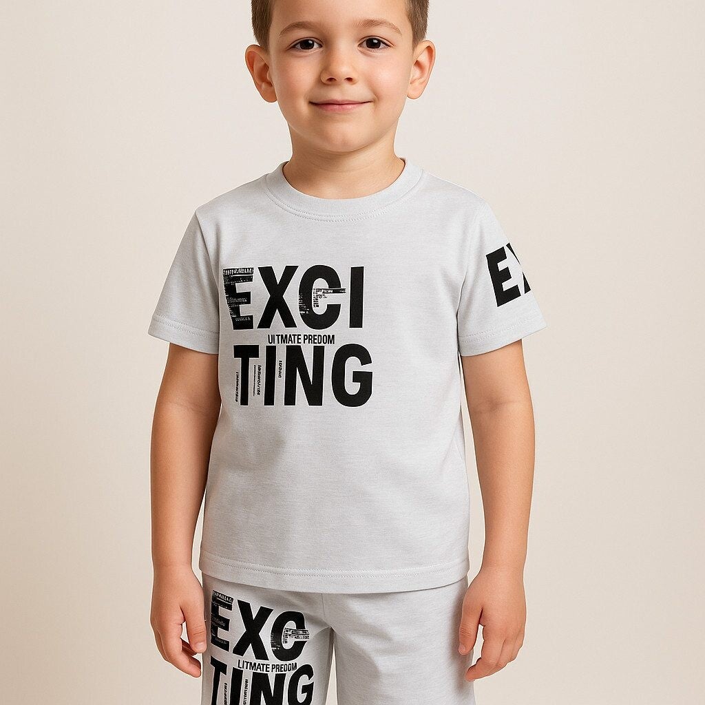 Gefertigt aus 100 % hochwertiger Baumwolle ist das Outfit angenehm weich, atmungsaktiv und sanft zur Haut – perfekt für warme Tage. Das kurzärmelige T-Shirt überzeugt mit dem trendigen Print „EXCITING“, während die passenden Shorts mit elastischem Bund maximale Bewegungsfreiheit bieten.