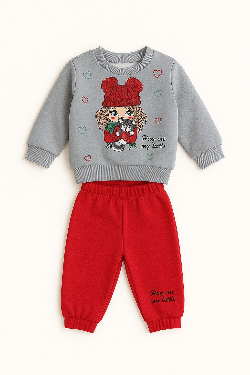 Der graue Pullover begeistert mit einer niedlichen Illustration eines Mädchens mit Wintermütze und einem süßen Kätzchen, umrahmt von bunten Herzchen. Dieses detailreiche Motiv macht das Oberteil zu einem echten Hingucker. Die leuchtend rote Hose setzt einen fröhlichen Farbkontrast und sorgt mit ihrem elastischen Bund für maximale Bewegungsfreiheit beim Spielen, Toben und Entdecken.