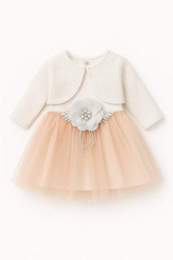 Gefertigt aus 100 % hochwertiger Baumwolle ist das Set besonders weich, atmungsaktiv und sanft zur empfindlichen Babyhaut. Der weich fallende Tüllrock in zartem Apricot verleiht dem Kleid eine festliche Leichtigkeit, während die große Blütenapplikation mit feinen Perlendetails an der Taille einen eleganten Blickfang bildet. Die strukturierte Jacke in Creme rundet das Outfit stilvoll ab und hält an kühleren Tagen angenehm warm.