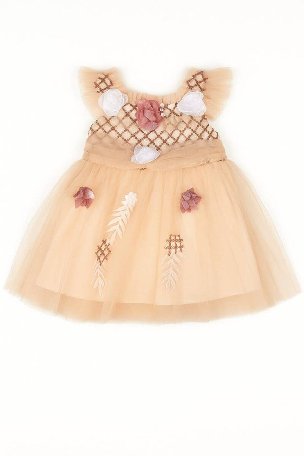 Dieses traumhafte Mädchenkleid in sanfter Pfirsichfarbe verzaubert mit liebevollen Details und einer eleganten Silhouette. Aufwendige Blumenapplikationen und filigrane Tülllagen machen es zu einem echten Hingucker für besondere Anlässe – perfekt für kleine Prinzessinnen, die sich gerne festlich kleiden.
